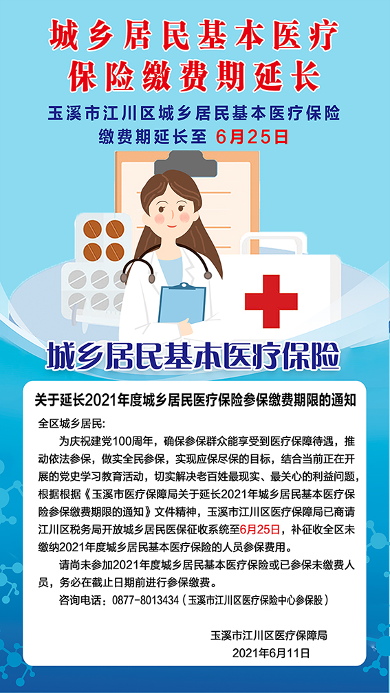 玉溪市江川區(qū)關(guān)于延長2021年度城鄉(xiāng)居民醫(yī)療保險(xiǎn)參保繳費(fèi)期限的通知