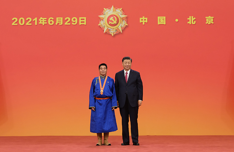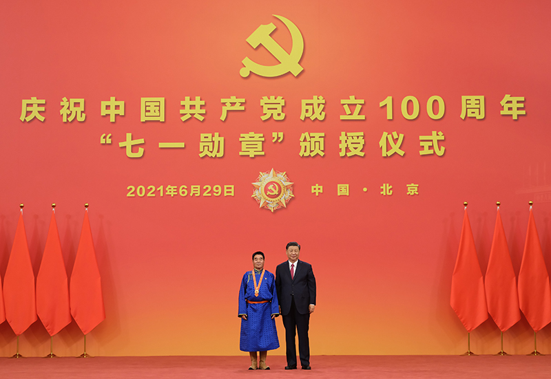 6月29日,慶祝中國共產(chǎn)黨成立100周年“七一勛章”頒授儀式在北京人民大會堂金色大廳隆重舉行。中共中央總書記、國家主席、中央軍委主席習(xí)近平向“七一勛章”獲得者廷·巴特爾頒授勛章。新華社記者 李學(xué)仁 攝