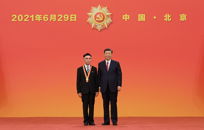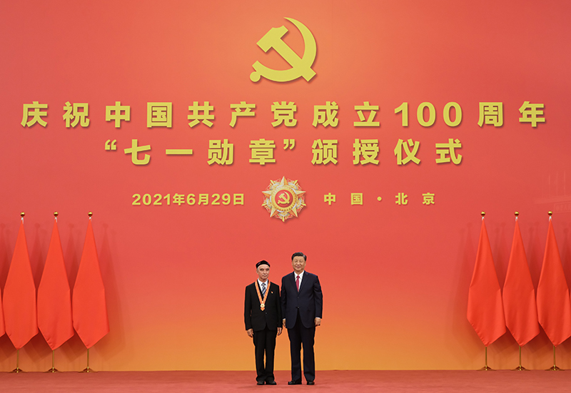 6月29日,慶祝中國共產(chǎn)黨成立100周年“七一勛章”頒授儀式在北京人民大會堂金色大廳隆重舉行。中共中央總書記、國家主席、中央軍委主席習(xí)近平向“七一勛章”獲得者買買提江·吾買爾頒授勛章。新華社記者 李學(xué)仁 攝