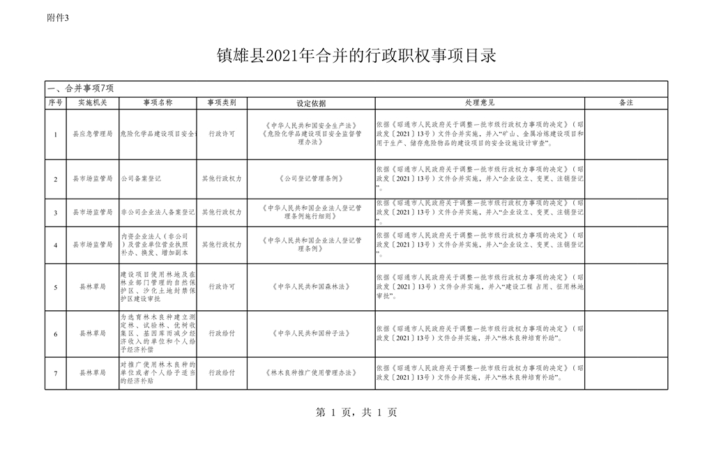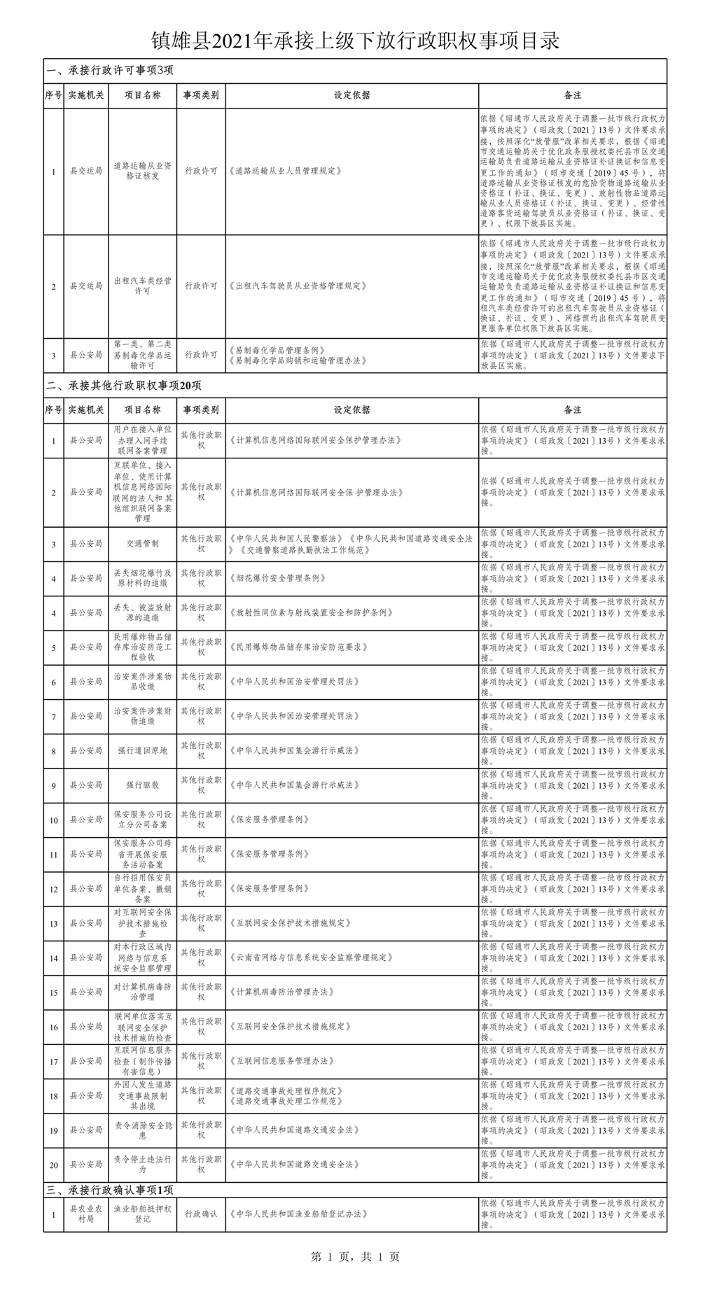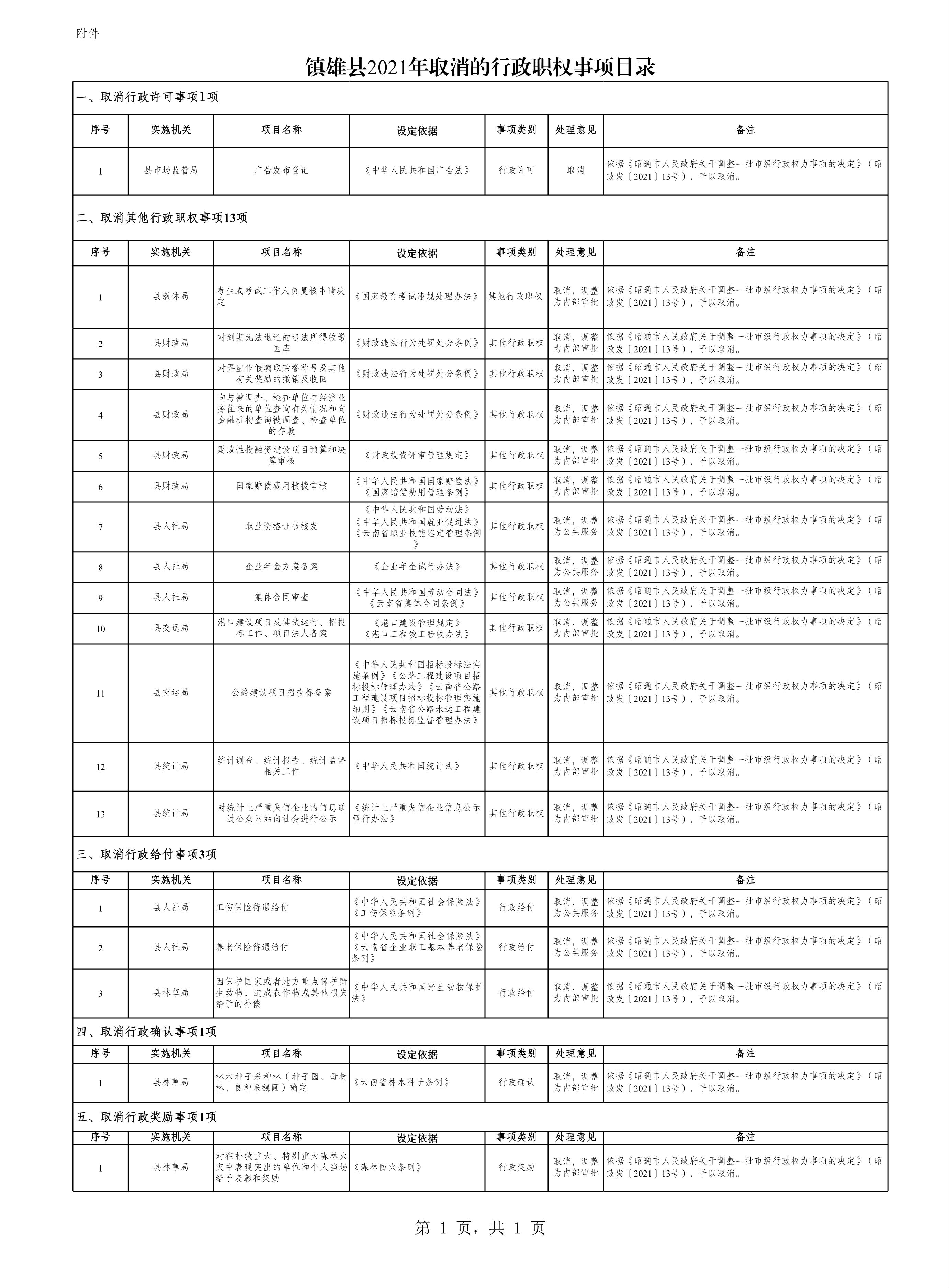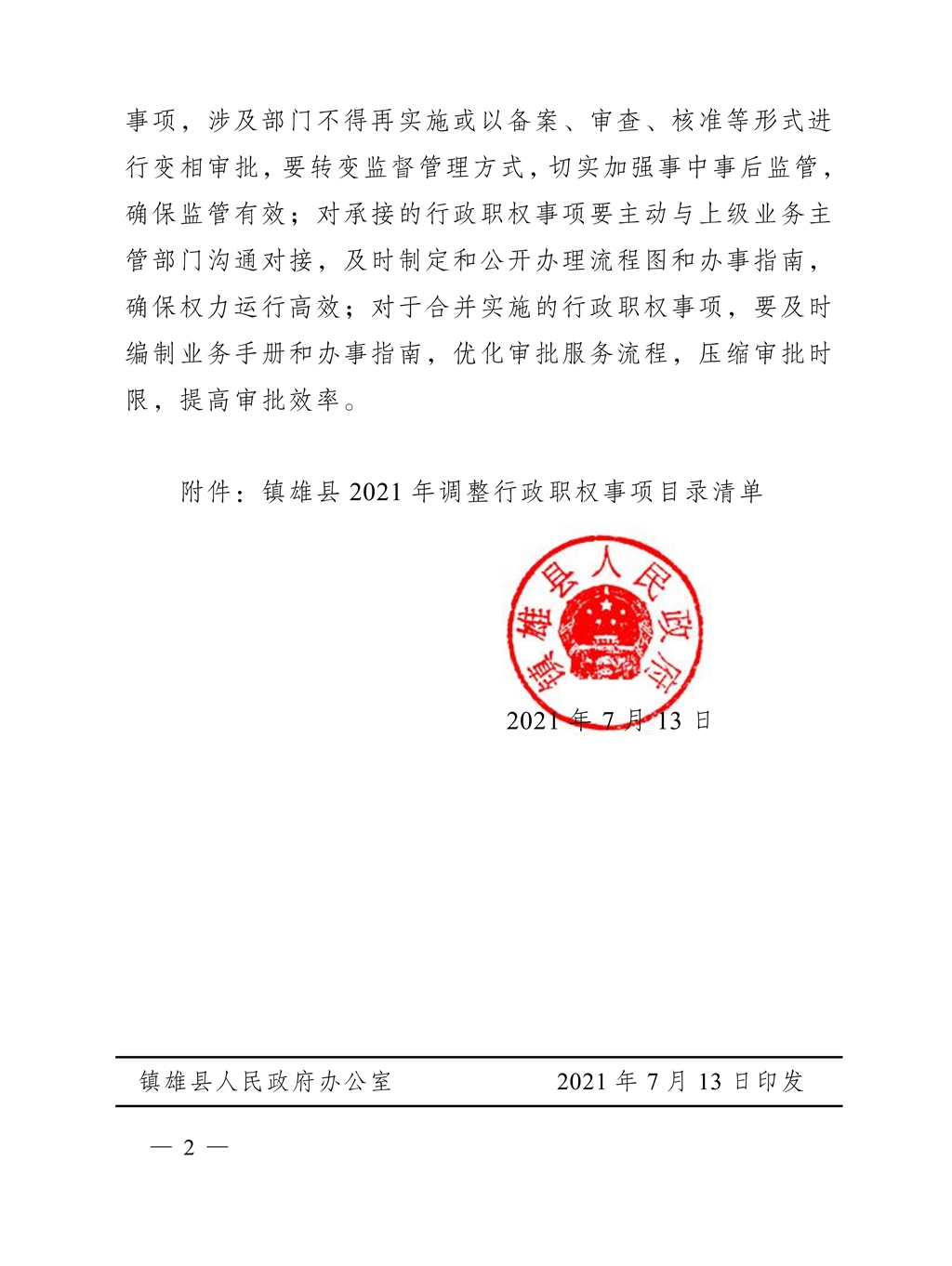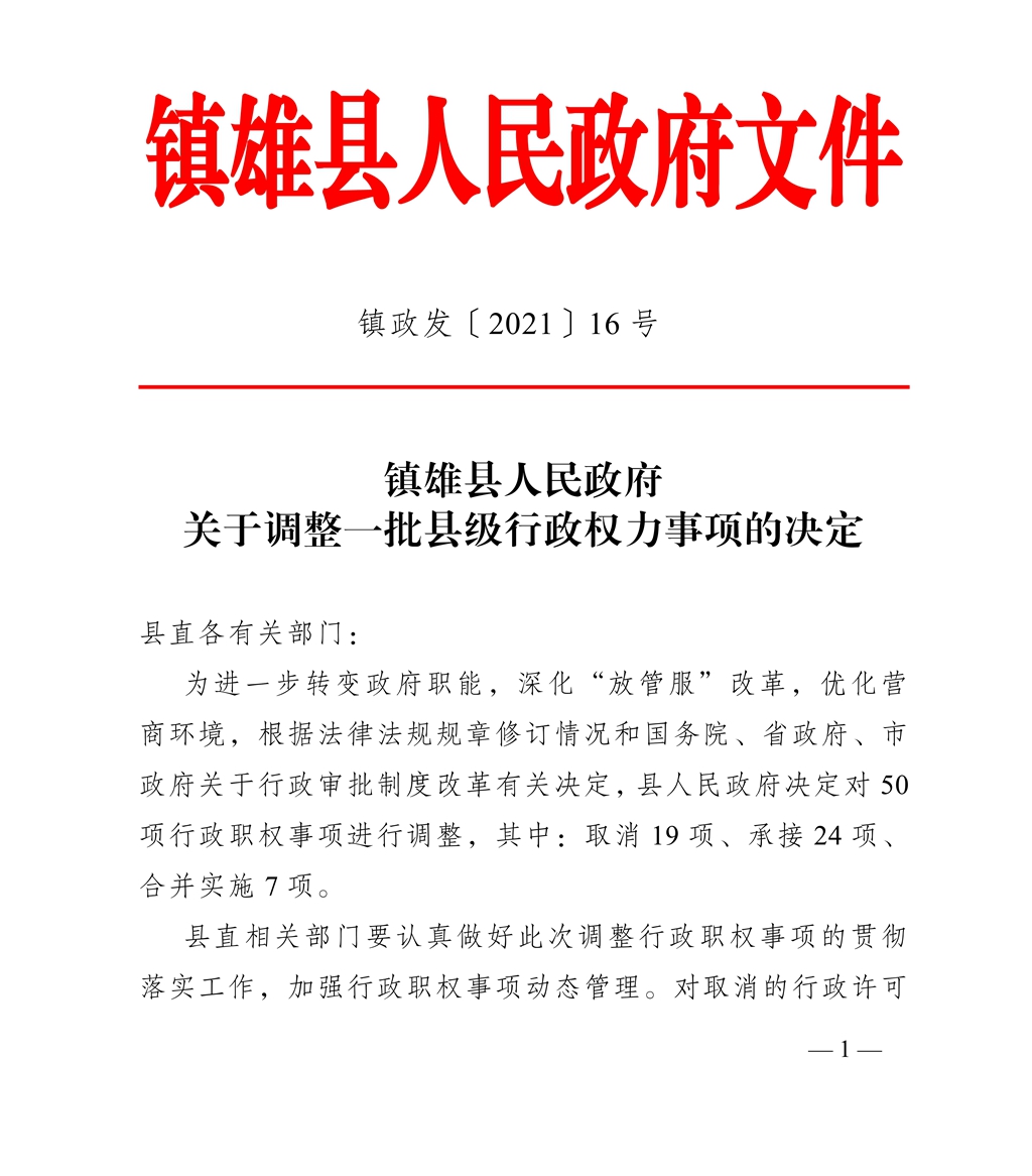 鎮(zhèn)雄縣人民政府關于調整一批縣級行政權力事項的決定