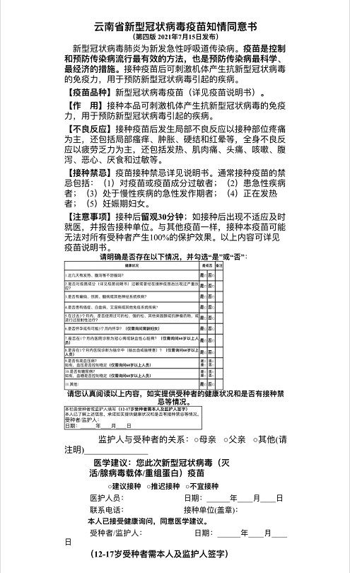 特別聲明:15~17歲人群接種時須攜帶本人身份證(沒有身份證的帶戶口本)及監(jiān)護人身份證,由監(jiān)護人陪同到疫苗接種點接種疫苗。接種現(xiàn)場各班班主任也會在現(xiàn)場,若不能到現(xiàn)場簽字的家長(監(jiān)護人),請在班級群里回復“某某學生家長,已認真閱讀云南省新型冠狀病毒疫苗知情同意書,因本人原因,不能到現(xiàn)場簽字,請委托某某老師代簽(監(jiān)護人簽字一欄),發(fā)生的一切后果由家長自行承擔,與簽字老師無關”。