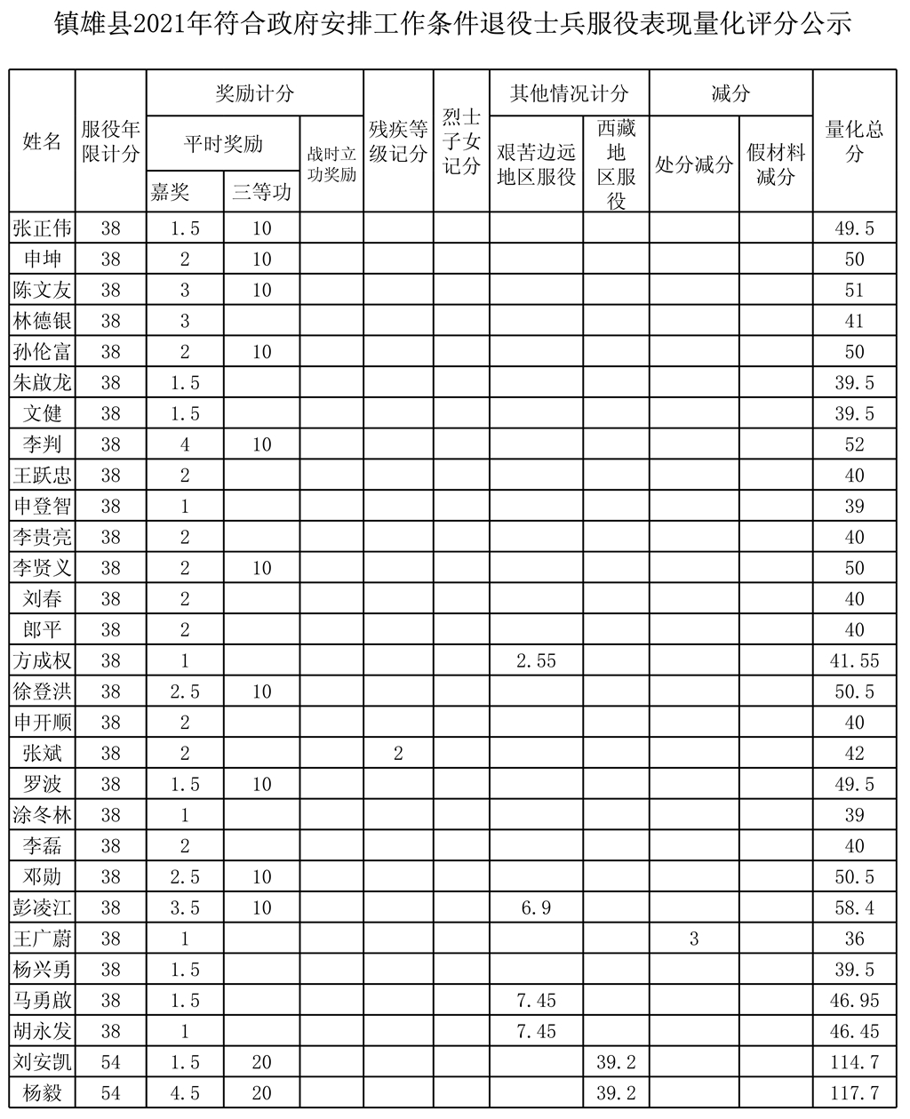 鎮(zhèn)雄縣2021年由政府安排工作退役士兵量化評分公示