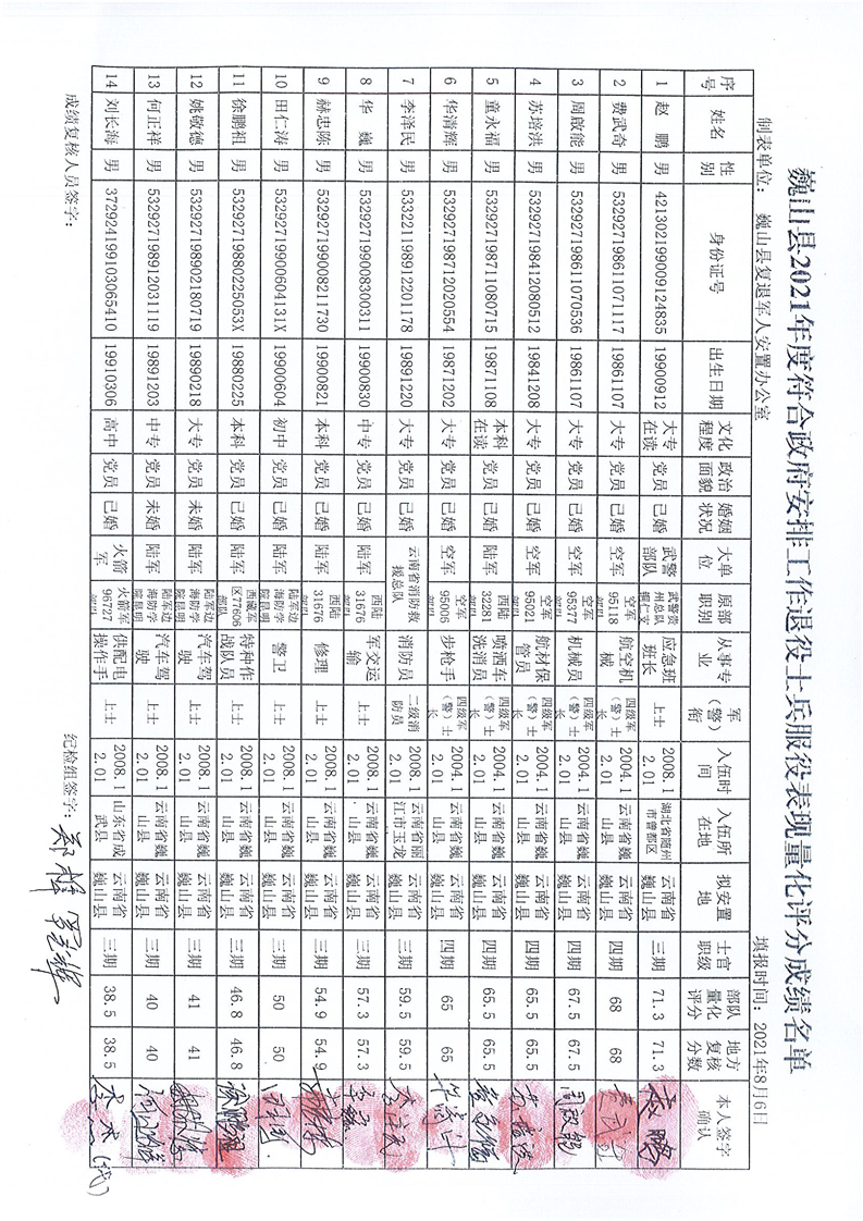 大理州巍山彝族回族自治縣復(fù)員退伍軍人安置辦公室關(guān)于巍山縣2021年士兵服役表現(xiàn)量化評分成績名單