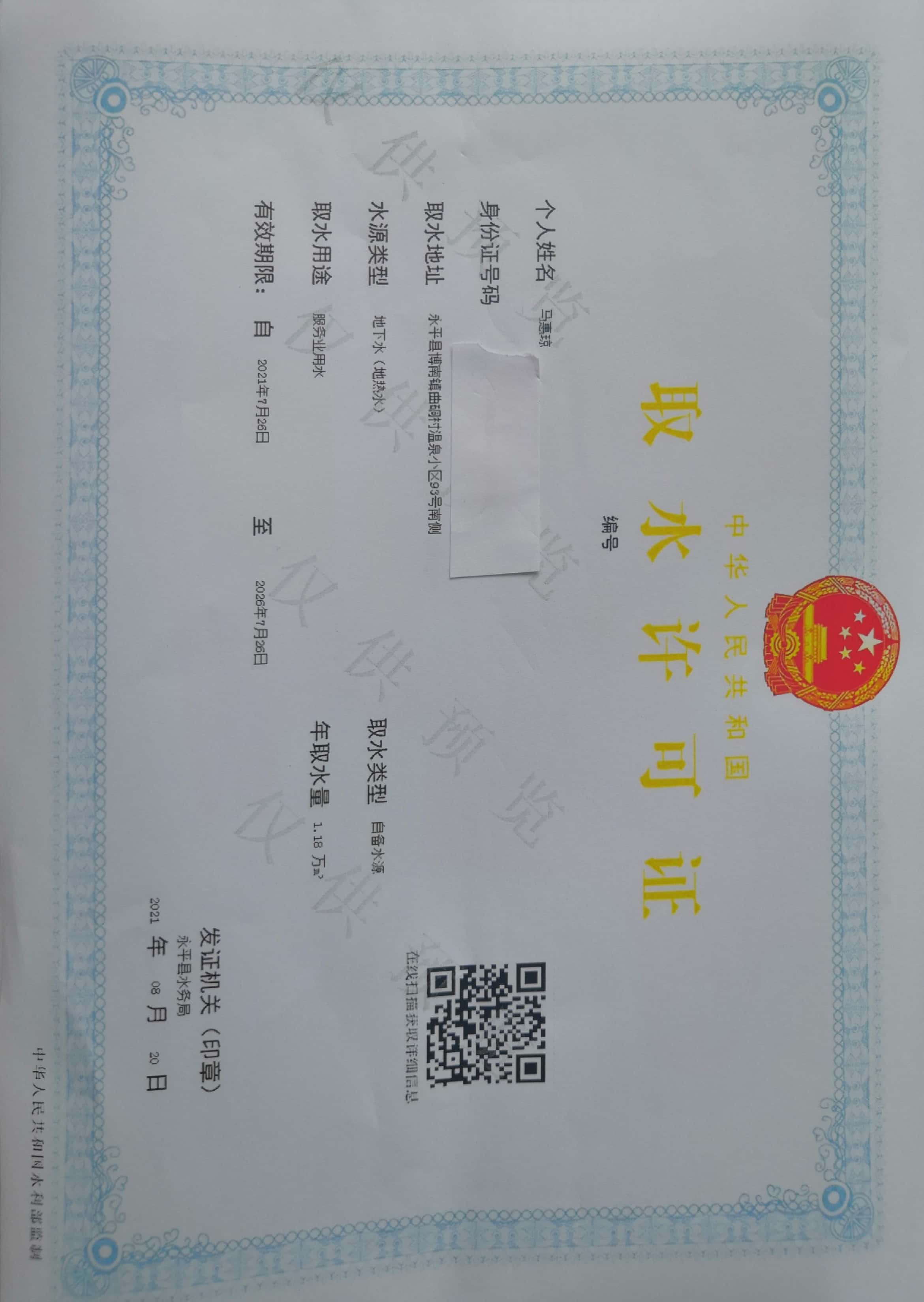你發(fā)來(lái)《永平惠瓊百貨經(jīng)營(yíng)部溫泉取水工程取水許可驗(yàn)收的函》已經(jīng)收悉。2021年8月18日我局組織驗(yàn)收工作組對(duì)取水設(shè)施進(jìn)行現(xiàn)場(chǎng)核查驗(yàn)收,驗(yàn)收組經(jīng)過(guò)驗(yàn)收出具了《永平惠瓊百貨經(jīng)營(yíng)部溫泉取水工程驗(yàn)收?qǐng)?bào)告》,同意通過(guò)驗(yàn)收。根據(jù)《取水許可和水資源費(fèi)征收管理?xiàng)l例》(國(guó)務(wù)院460號(hào)令)和《取水許可管理辦法》(水利部34號(hào)令)的相關(guān)規(guī)定,經(jīng)我局研究,現(xiàn)決定如下: