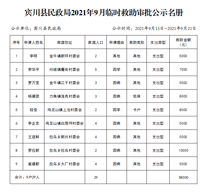 大理市賓川縣民政局2021年9月臨時(shí)救助審批公示