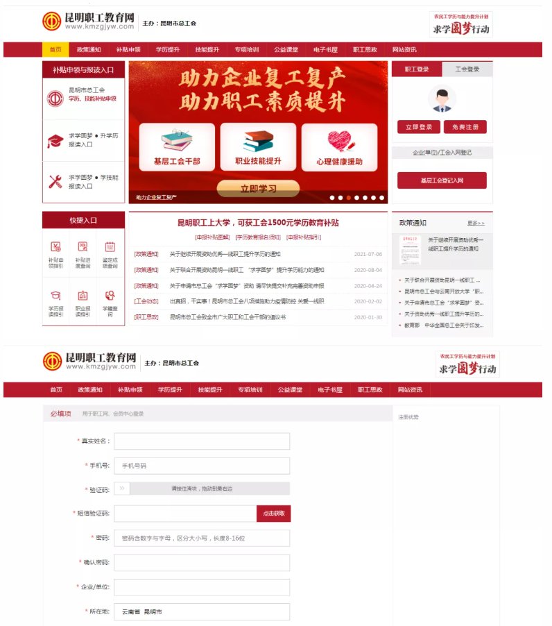 【通道二】瀏覽器昆明市職工教育網(wǎng),右側(cè)職工登錄——立即登錄。未注冊賬號職工在網(wǎng)站填寫注冊資料完成注冊;已注冊賬號職工在右側(cè)的登錄界面進(jìn)行登錄。