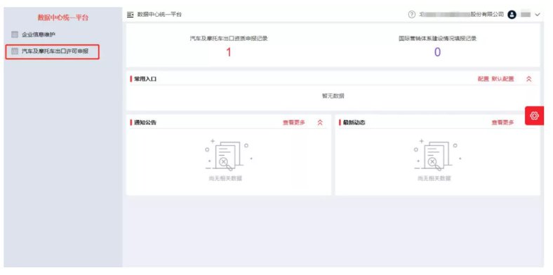 成功登錄系統(tǒng)后,首頁左側(cè)為功能菜單導(dǎo)航區(qū)。包括【企業(yè)概要】【汽車及摩托車出口許可申報】,右側(cè)工作區(qū)上方會顯示企業(yè)當前的業(yè)務(wù)數(shù),通過點擊數(shù)字可快速進入相應(yīng)應(yīng)用。