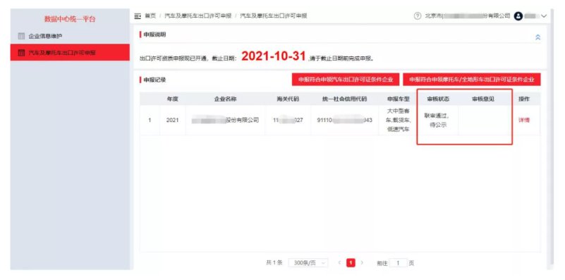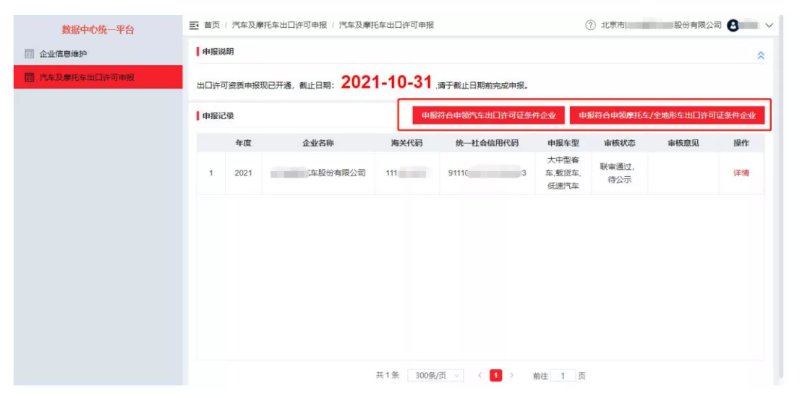 通過點擊功能菜單【汽車及摩托車出口許可申報】進入出口許可申報列表頁面。列表展示已經(jīng)申報的記錄及審批狀態(tài)。