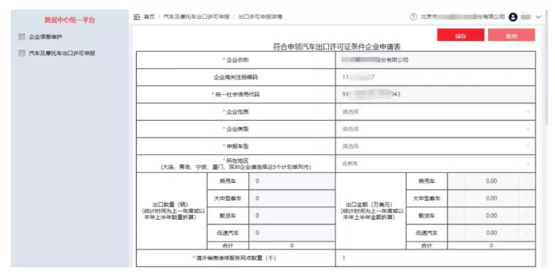 通過點擊按鈕【申報符合申領(lǐng)汽車出口許可證條件企業(yè)】或【申報符合申領(lǐng)摩托車/全地形車出口許可證條件企業(yè)】可進入相應(yīng)的申報頁面。