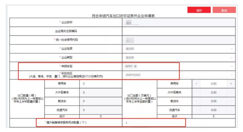 選擇【申報車型】后,相應(yīng)的車型出口數(shù)量和出口金額方能編輯,其中申報車型可多選。注意選擇【所在地區(qū)】【境外銷售維修服務(wù)網(wǎng)點數(shù)量(個)】。