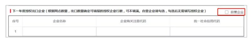 授權(quán)出口企業(yè)表格會根據(jù)企業(yè)維護的境外銷售維修服務(wù)網(wǎng)點數(shù)量、出口數(shù)量信息自動確定表格行數(shù),不能增減,企業(yè)可不填滿,但如果非自營企業(yè)至少需填寫1行。自營企業(yè)請勾選自營企業(yè)標識,勾選后無需填寫授權(quán)出口企業(yè)。