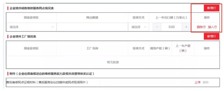 企業(yè)根據(jù)自身情況,填寫企業(yè)境外銷售維修服務(wù)網(wǎng)點情況表、企業(yè)境外工廠情況表,可進行新增行、刪除行。其中境外銷售維修服務(wù)網(wǎng)點合計數(shù)需與前面填寫的境外銷售維修服務(wù)網(wǎng)點數(shù)量(個)保持一致。