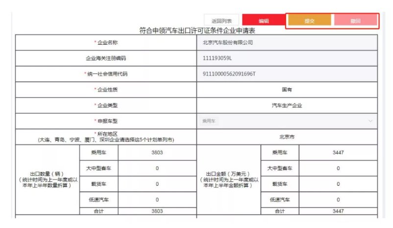 確認填報信息無誤后,點擊界面中的【提交】按鈕,商務(wù)主管部門即可收到相應(yīng)的申報信息,在商務(wù)主管部門尚未審批前可通過點擊【撤回】按鈕撤回申報,撤回的申報可再次編輯,提交。