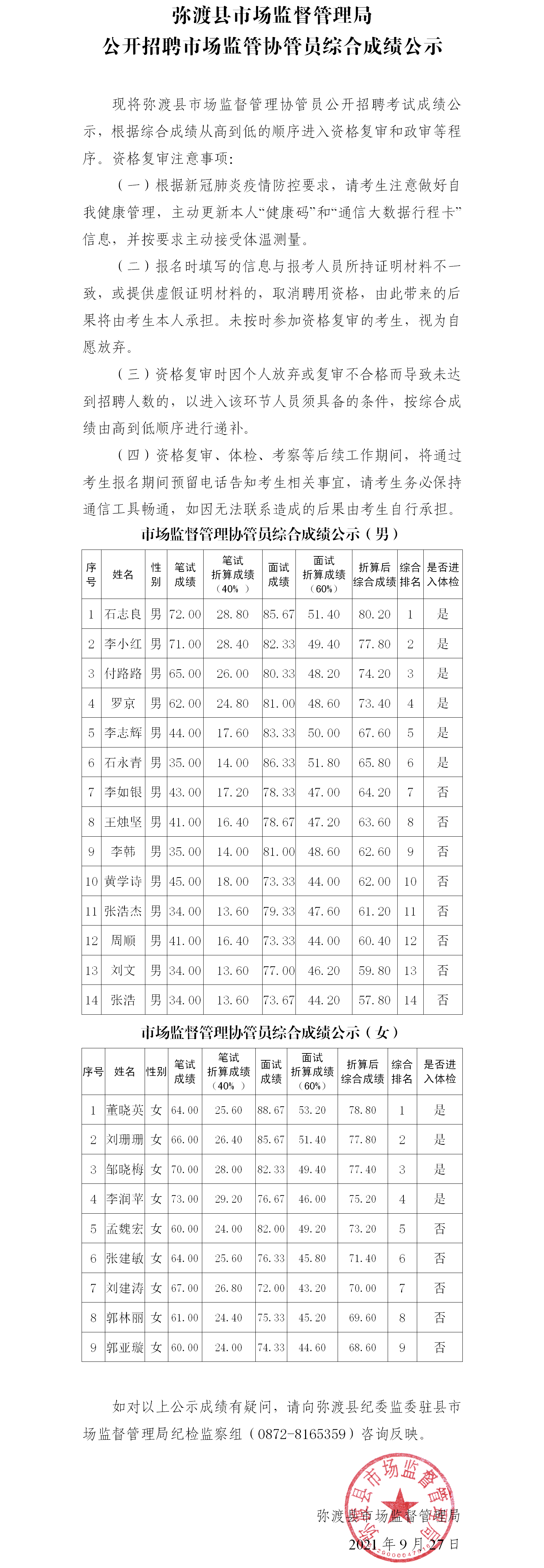 昆明市彌渡縣市場監(jiān)督管理局公開招聘市場監(jiān)管協(xié)管員綜合成績公示