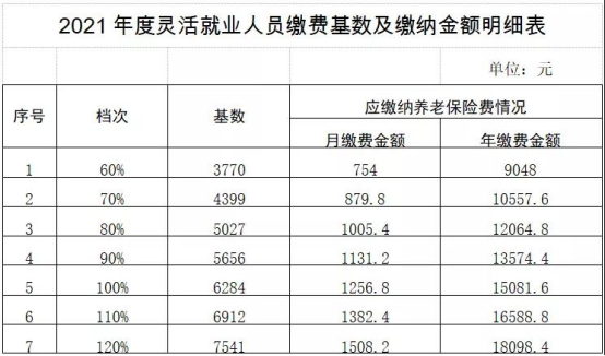 近日,云南省人力資源和社會保障廳、國家稅務(wù)總局云南省稅務(wù)局印發(fā)了《2021年度靈活就業(yè)人員參加企業(yè)職工基本養(yǎng)老保險(xiǎn)申報(bào)核定繳費(fèi)的公告》,明確共有25個(gè)繳費(fèi)檔次可供參保人員自主選擇,其中最低繳費(fèi)基數(shù)為3770元,月繳費(fèi)金額754元;最高繳費(fèi)基數(shù)為18852元,月繳費(fèi)金額3770.4元,繳費(fèi)基數(shù)一經(jīng)繳費(fèi)人員確定,本年度內(nèi)不得變更。