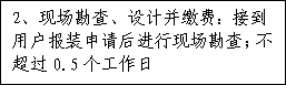 對已供氣小區(qū)的客戶的管道安裝(零星掛表),在客戶提交用氣需求并完成繳費后3個工作日內(nèi)完成通氣點火工作。 |