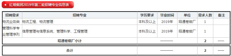 結(jié)合紅塔集團昭通卷煙廠專業(yè)結(jié)構(gòu)及人員需求情況,現(xiàn)計劃新增招聘2人,具體招聘需求、專業(yè)、名額及相關(guān)條件詳見招聘專業(yè)信息表(見下)。