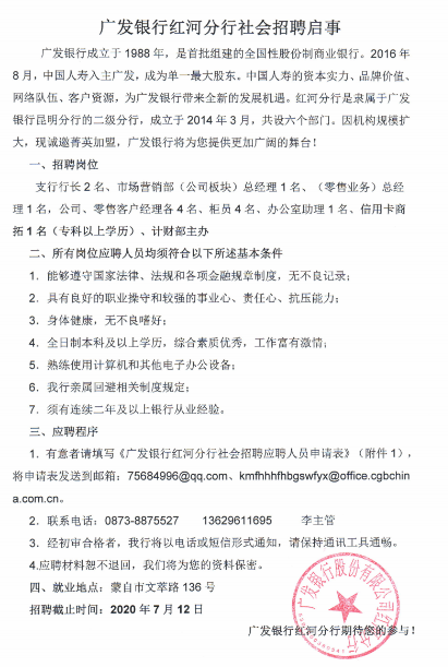 廣發(fā)銀行紅河分行社會(huì)招聘啟事