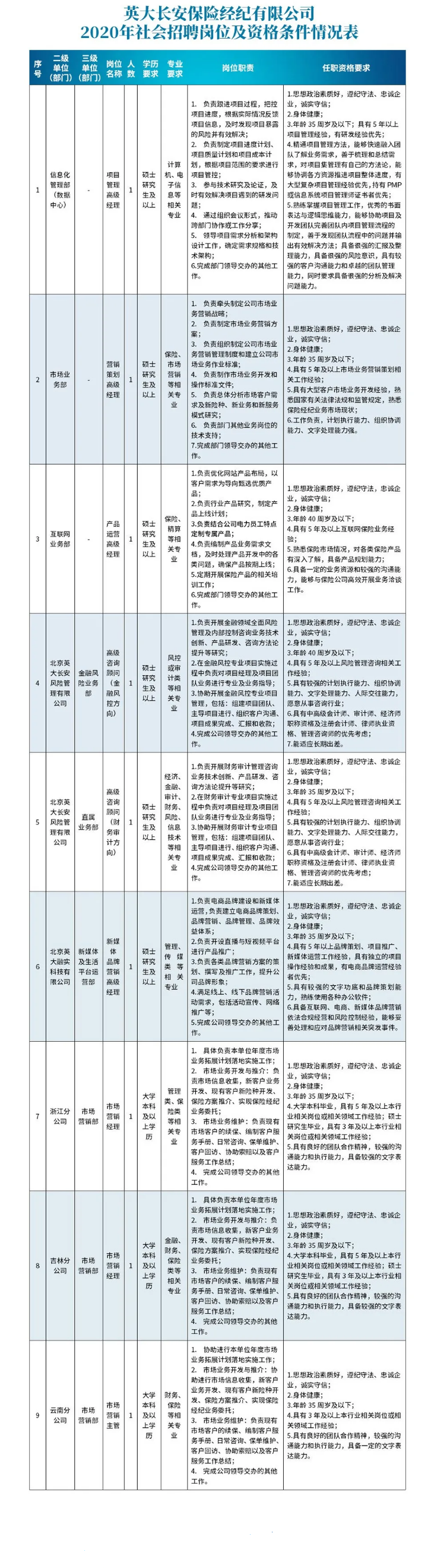 本次英大長安本部及分支機構(gòu)公開招聘崗位9個,分別是項目管理高級經(jīng)理、營銷策劃高級經(jīng)理、產(chǎn)品運營高級經(jīng)理、高級咨詢顧問(金融風(fēng)控方向)、高級咨詢顧問(財務(wù)審計方向)、新媒體品牌營銷高級經(jīng)理、浙江分公司市場營銷經(jīng)理、吉林分公司市場營銷經(jīng)理、云南分公司市場營銷主管,招聘人數(shù)共9人。各崗位職責(zé)、學(xué)歷要求、專業(yè)要求、任職資格條件詳見《英大長安保險經(jīng)紀(jì)有限公司2020年社會招聘崗位及資格條件情況表》。