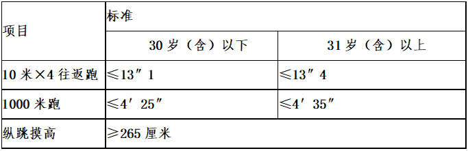 2.體能測試為達(dá)標(biāo)制,并采取一票否決制。達(dá)到規(guī)定項目標(biāo)準(zhǔn)即為合格,否則為不合格,進(jìn)入筆試環(huán)節(jié)。