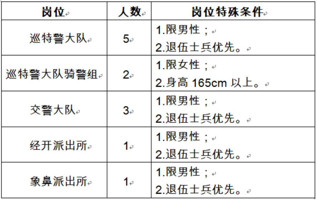 本次招聘崗位為祥云縣公安局巡特警大隊(duì)、交警大隊(duì)、經(jīng)開(kāi)派出所、象鼻派出所警務(wù)輔助人員,用工形式為勞務(wù)派遣,主要工作職責(zé)為協(xié)助民警完成各項(xiàng)工作;本次招聘的警務(wù)輔助人員不納入編制管理,不具有人民警察和國(guó)家公務(wù)員身份,不行使人民警察職權(quán)。本次共計(jì)招聘警務(wù)輔助人員12名。其中巡特警大隊(duì)7名(男性5名,女騎警2名)、交警大隊(duì)3名、經(jīng)開(kāi)派出所1名、象鼻派出所1名。具體招聘崗位、人數(shù)如下: