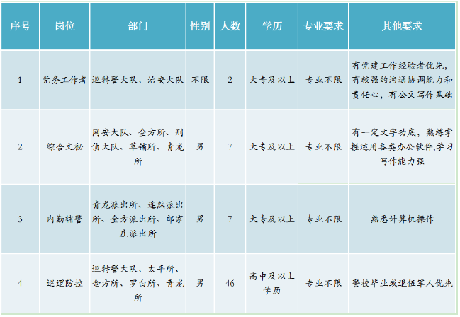 2.優(yōu)先招聘退役士官士兵、見義勇為積極分子和先進(jìn)個(gè)人、政法類和警察類院校畢業(yè)生;