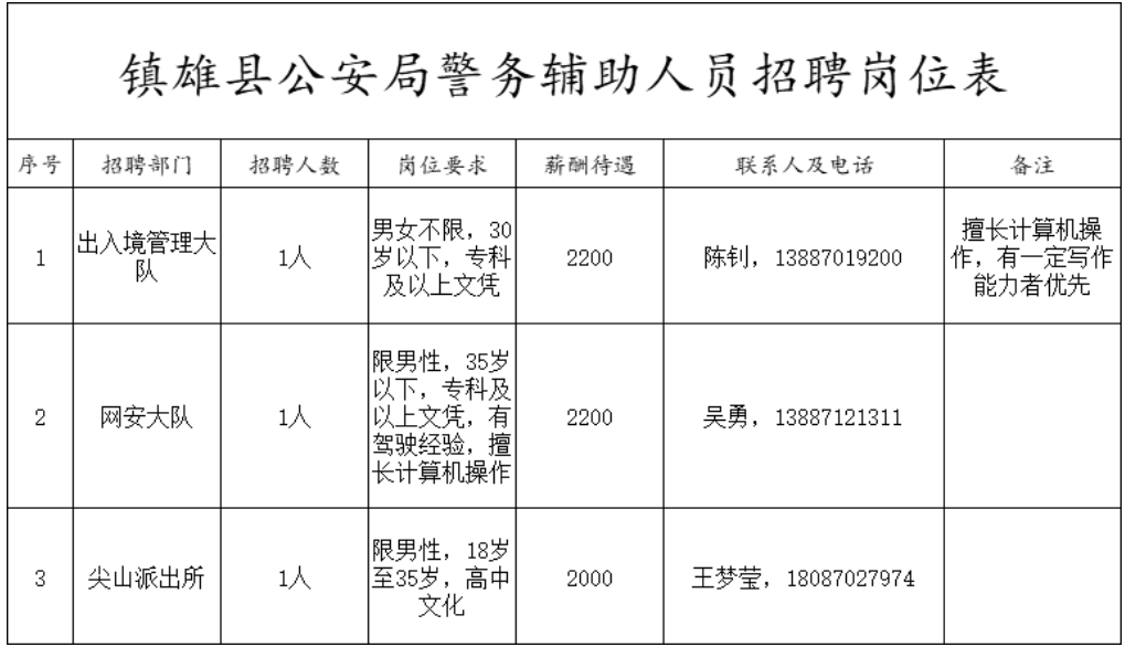 崗位設(shè)置、工資待遇以及其他要求,詳見《鎮(zhèn)雄縣公安局警務(wù)輔助人員招聘崗位表》(附件)。