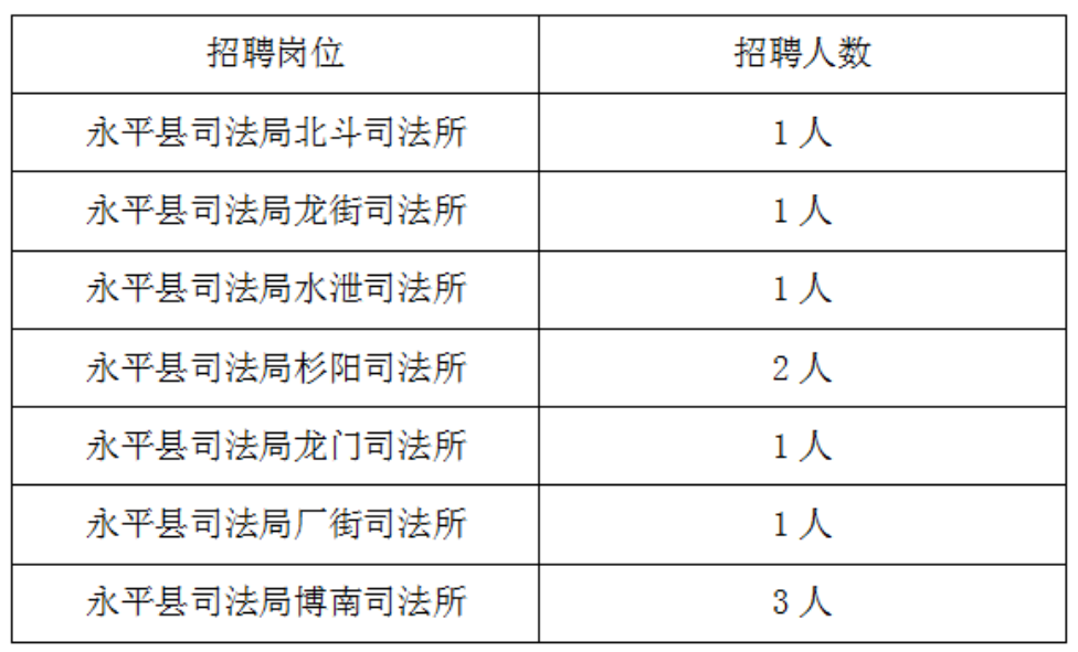 根據(jù)永平縣司法局社區(qū)矯正工作需要,需我公司派遣10名司法輔助人員至各鄉(xiāng)鎮(zhèn)司法所開(kāi)展輔助性工作,具體招聘事宜如下: