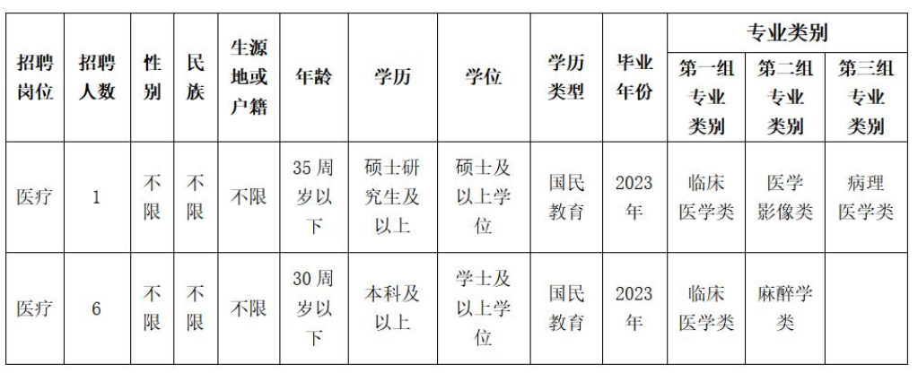 高等院校醫(yī)學類本科及以上學歷畢業(yè)后直接參加國家計劃內(nèi)住院醫(yī)師規(guī)范化培訓,2023年國家住院醫(yī)師規(guī)范化培訓合格且具有國家執(zhí)業(yè)醫(yī)師資格,參加醫(yī)療衛(wèi)生行業(yè)招聘醫(yī)學類崗位的,視為2023年度應屆畢業(yè)生(資格復審時須提供成績單、合格證明,否則取消聘用資格)。