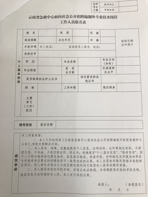 附件:云南省急救中心面向社會(huì)公開招聘編制外專業(yè)技術(shù)崗位人員報(bào)名表